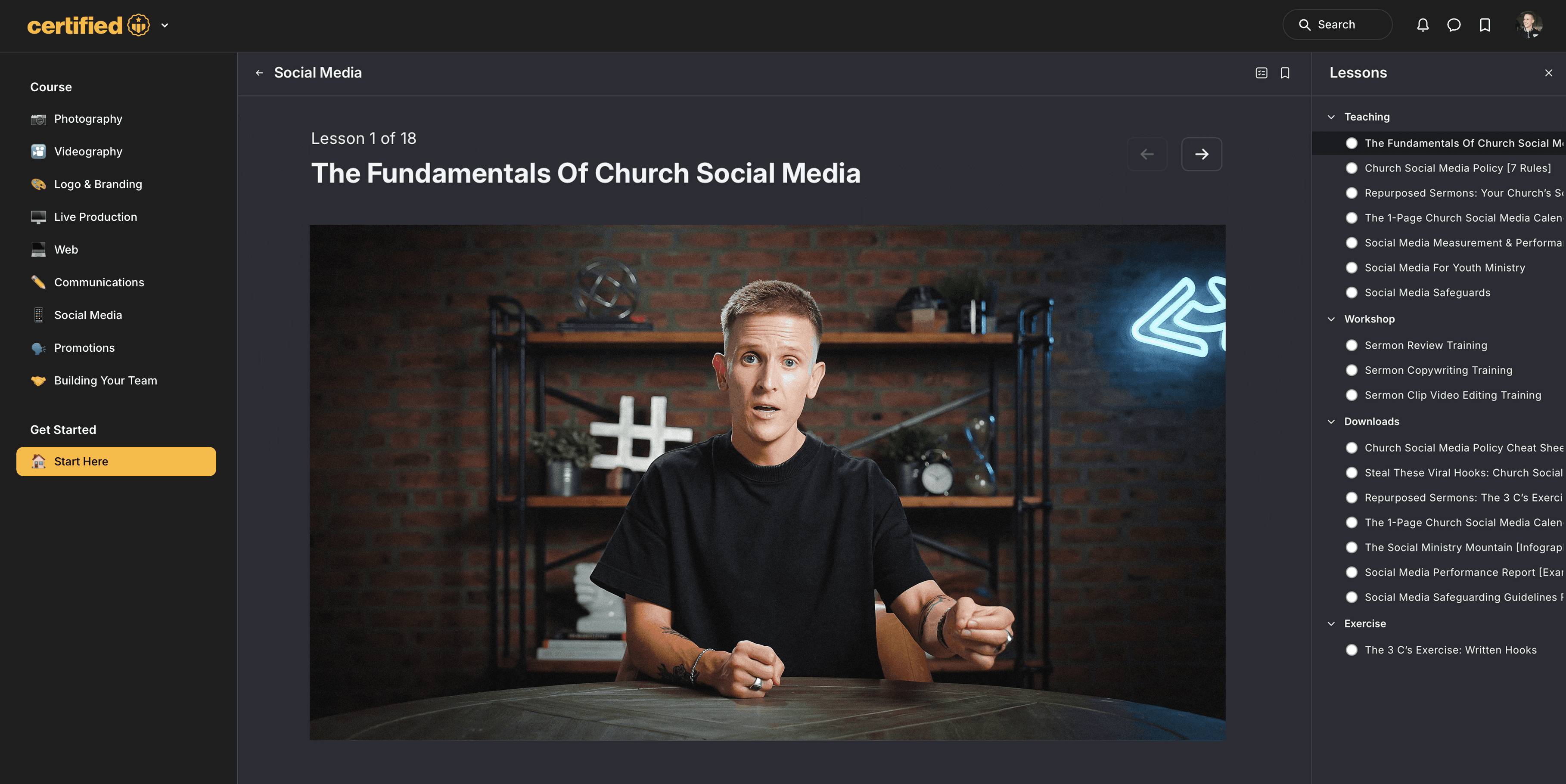 Every Sunday you're figuring out camera angles, social posts, and sermon graphics on the fly. By the time you finish Certified, you'll have a system for all of it - and the confidence to train someone else.